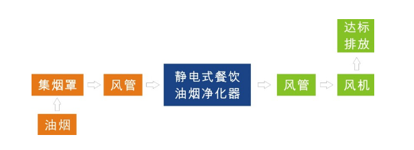 从炒锅中散发出来的含油烟气体,经过烟罩和管道的收集后,进入静电除油烟设备,在高压静电的作用下,烟气中的绝大部分油份被滤除掉(电场净化率≥90%),再经引风机直接抽风达标排放。
